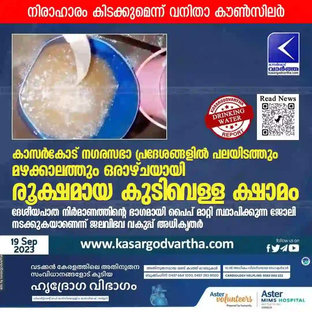 Drinking Water | കാസർകോട് നഗരസഭയിൽ പലയിടത്തും മഴക്കാലത്തും ഒരാഴ്ചയായി രൂക്ഷമായ കുടിവെള്ള ക്ഷാമം; ദേശീയപാത നിർമാണത്തിൻ്റെ ഭാഗമായി പൈപ് മാറ്റി സ്ഥാപിക്കുന്ന ജോലി നടക്കുകയാണെന്ന് ജലവിഭവ വകുപ്പ് അധികൃതർ