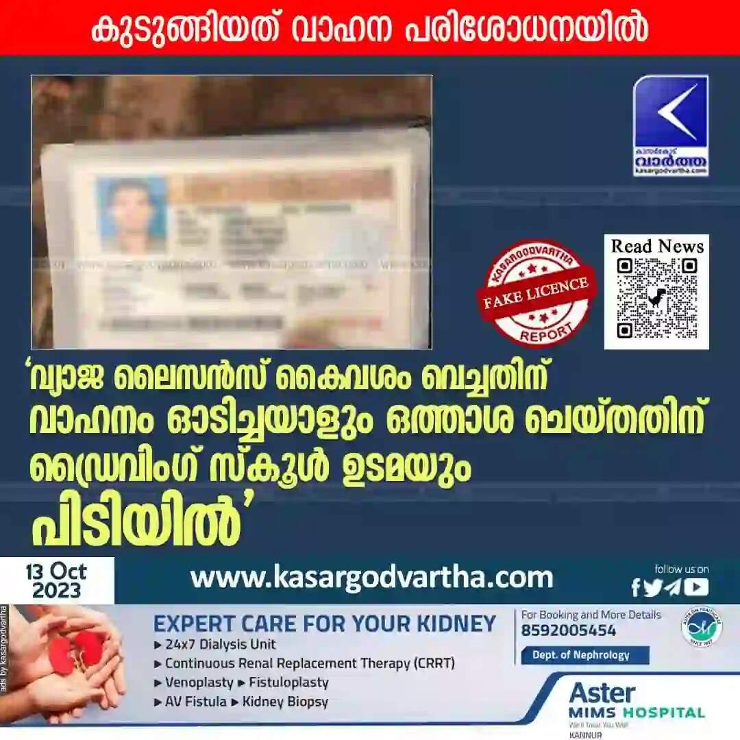 Fake license | 'വ്യാജ ലൈസൻസ് കൈവശം വെച്ചതിന് വാഹനം ഓടിച്ചയാളും ഒത്താശ ചെയ്തതിന് ഡ്രൈവിംഗ് സ്കൂൾ ഉടമയും പിടിയിൽ'