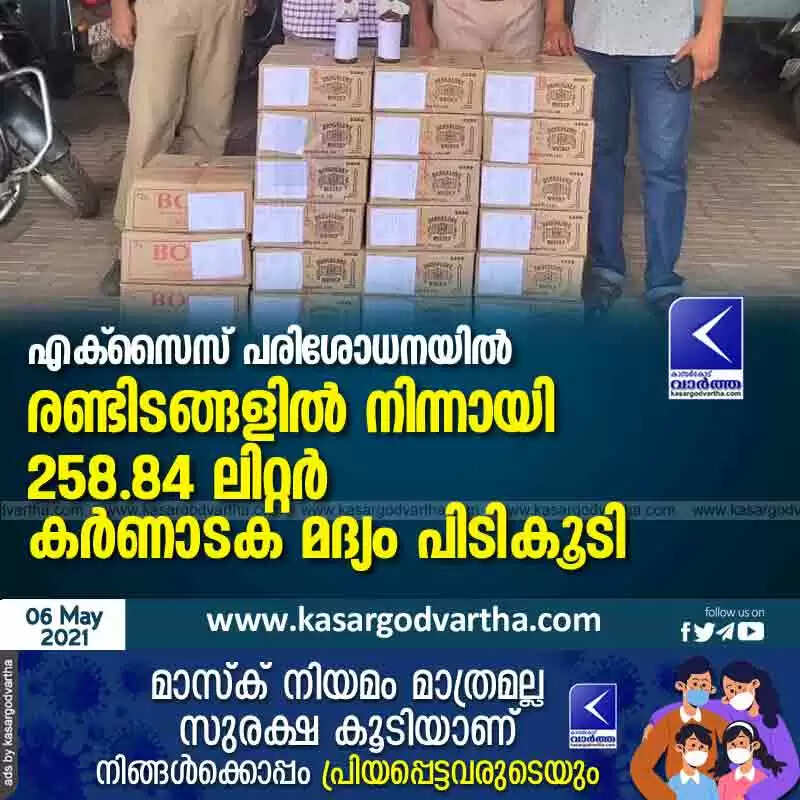 എക്സൈസ് പരിശോധനയിൽ രണ്ടിടങ്ങളിൽ നിന്നായി 258.84 ലിറ്റര് കര്ണാടക മദ്യം പിടികൂടി