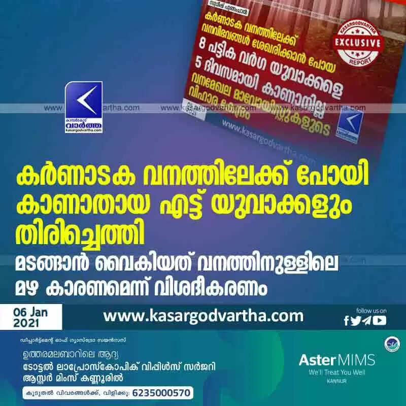Keywords: Kerala, News, Forest, Youth, Police, Rain, Top-Headlines, Missing, Forest-range-officer, Eight ST youths who went missing to collect forest resources in Karnataka returned on Wednesday morning.