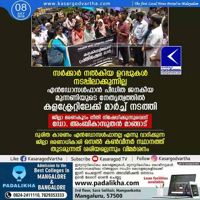 സര്ക്കാര് നല്കിയ ഉറപ്പുകള് നടപ്പിലാക്കുന്നില്ല; എന്ഡോസള്ഫാന് പീഡിത ജനകീയ മുന്നണിയുടെ നേതൃത്വത്തില് കളക്ട്രേറ്റിലേക്ക് മാര്ച്ച് നടത്തി, ജില്ലാ ഭരണകൂടം നീതി നിഷേധിക്കുന്നുവെന്ന് ഡോ. അംബികാസുതന് മാങ്ങാട്, ദുരിത കാരണം എന്ഡോസള്ഫാനല്ല എന്നു വാദിക്കുന്ന ജില്ലാ ഭരണാധികാരി സെല് കണ്വീനര് സ്ഥാനത്ത് തുടരുന്നത് ശരിയല്ലെന്നും വിമര്ശനം
