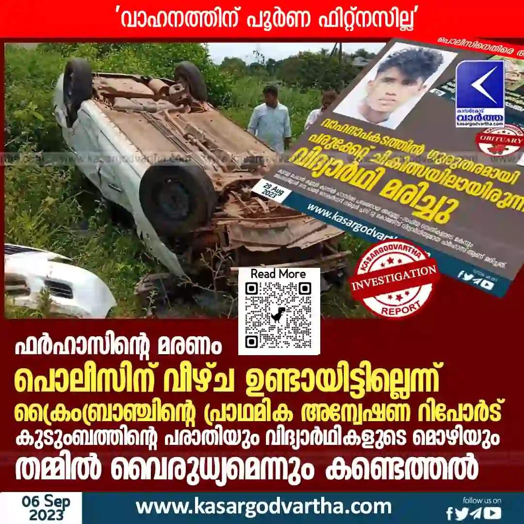 കാസർകോട്: (www.kasargodvartha.com) കാർ മറിഞ്ഞ് കുമ്പള പേരാൽ കണ്ണൂർ കുന്നിൽ ഹൗസിലെ പരേതനായ അബ്ദുല്ല - സഫിയ ദമ്പതികളുടെ മകനും അംഗഡിമുഗർ ഗവ. ഹയർ സെകൻഡറി സ്‌കൂൾ പ്ലസ് ടു വിദ്യാർഥിയുമായ ഫർഹാസ് (17) മരണപ്പെട്ട സംഭവത്തിൽ പൊലീസിന് വീഴ്ച ഉണ്ടായിട്ടില്ലെന്ന് ക്രൈംബ്രാഞ്ചിന്റെ പ്രാഥമിക അന്വേഷണ റിപോർട്. പൊലീസ് പിന്തുടർന്നതാണ് വിദ്യാർഥികൾ സഞ്ചരിച്ച കാർ അപകടത്തിൽ പെടാൻ കാരണമായതെന്നായിരുന്നു ആരോപണം.