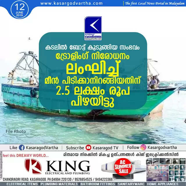 കാഞ്ഞങ്ങാട്: (www.kasargodvartha.com 12.06.2019) കടലില്‍ കുടുങ്ങിയ ബോട്ട് ഫിഷറീസ് വകുപ്പ് രക്ഷിച്ചതിനു പിന്നാലെ ട്രോളിംഗ് നിരോധനം ലംഘിച്ച് മീന്‍ പിടിക്കാനിറങ്ങിയതിന് 2.5 ലക്ഷം രൂപ പിഴയിട്ടു. ബോട്ടുടമയും സ്രാങ്കുമായ തമിഴ്‌നാട് സ്വദേശി തദ്ദേവൂസിനാണ് പിഴയിട്ടത്. ഇതുസംബന്ധിച്ച് നോട്ടീസ് കൈമാറിയതായി ഫിഷറീസ് വകുപ്പ് അറിയിച്ചു. ട്രോളിംഗ് നിരോധനം ലംഘിച്ചതിനും ബോട്ടിന് മീന്‍പിടിക്കാനുള്ള ലൈസന്‍സ് ഇല്ലാത്തതിനുമാണിത്.