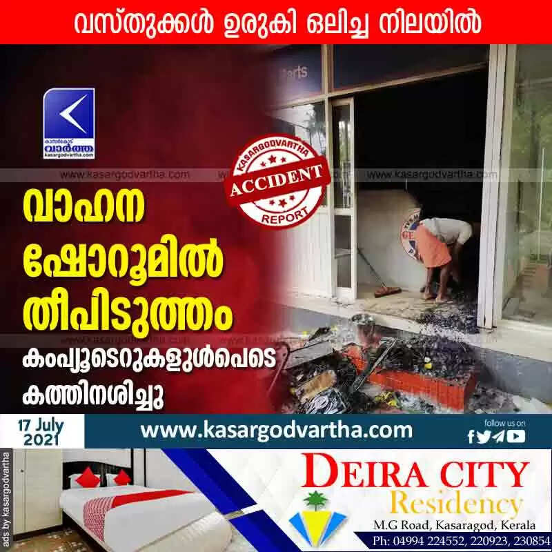 Keywords: Kasaragod, News, Rajapuram, Vehicles, Petrol-pump, Natives, Top-Headlines, Computer, Perumbala, Fire at vehicle showroom.