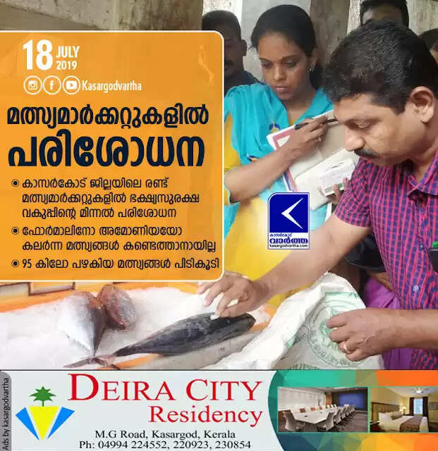 കാസര്കോട് ജില്ലയിലെ രണ്ട് മത്സ്യമാര്ക്കറ്റുകളില് ഭക്ഷ്യസുരക്ഷ വകുപ്പിന്റെ മിന്നല് പരിശോധന; ഫോര്മാലിനോ അമോണിയയോ കലര്ന്ന മത്സ്യങ്ങള് കണ്ടെത്താനായില്ല, 95 കിലോ പഴകിയ മത്സ്യങ്ങള് പിടികൂടി