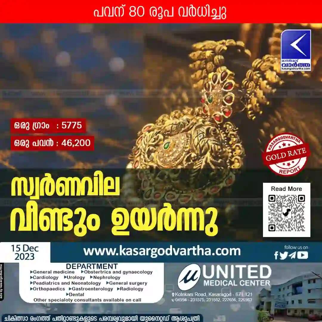 കൊച്ചി: (KasargodVartha) സംസ്ഥാനത്ത് സ്വർണവിലയിൽ കുതിപ്പ് തുടരുന്നു. വെള്ളിയാഴ്ച (15.12.2023) ഒരു ഗ്രാം 22 കാരറ്റ് സ്വര്ണത്തിന് 10 രൂപയും പവന് 80 രൂപയും വർധിച്ചു. ഒരു ഗ്രാം 22 കാരറ്റ് സ്വര്ണത്തിന് 5775 രൂപയിലും ഒരു പവന് 22 കാരറ്റിന് 46,200 രൂപയിലുമാണ് വ്യാപാരം നടക്കുന്നത്.
