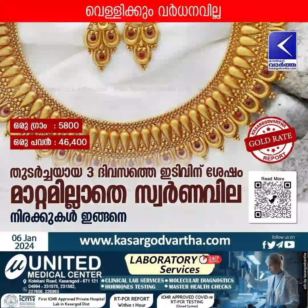 കൊച്ചി: (KasargodVartha) തുടർച്ചയായ മൂന്ന് ദിവസത്തെ ഇടിവിന് ശേഷം മാറ്റമില്ലാതെ സ്വർണവില. ശനിയാഴ്ച (06.01.2024) ഒരു ഗ്രാം 22 കാരറ്റ് സ്വര്ണത്തിന് 5800 രൂപയിലും ഒരു പവന് 22 കാരറ്റിന് 46,400 രൂപയിലുമാണ് വ്യാപാരം നടക്കുന്നത്. ഒരു ഗ്രാം 18 കാരറ്റ് സ്വര്ണത്തിന് 4800 രൂപയും പവന് 38,400 രൂപയുമാണ് വിപണി വില. വെള്ളി വിലയിലും മാറ്റമില്ല. ഒരു ഗ്രാം സാധാരണ വെള്ളിക്ക് 78 രൂപയും ഒരു ഗ്രാം ഹാള്മാര്ക് വെള്ളിക്ക് 103 രൂപയുമാണ് നിരക്ക്.