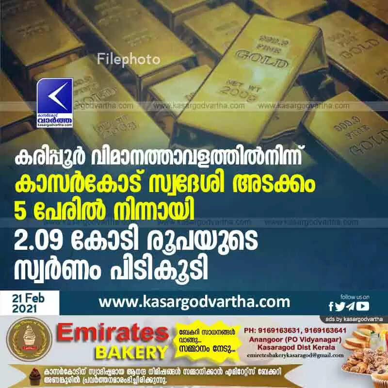 Keywords:  Seized, Gold, Jewellery, Kozhikode, Kasaragod, Kerala, News, Top-Headlines, Gold worth Rs 2.09 crore was seized from Karipur airport by five persons, including a Kasargod resident.