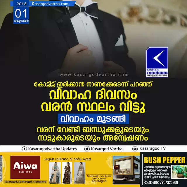 കുമ്പള: (www.kasargodvartha.com 01.10.2018) കോട്ടിട്ട് ഇരിക്കാന്‍ നാണക്കേടെന്ന് പറഞ്ഞ് വിവാഹ ദിവസം വരന്‍ സ്ഥലം വിട്ടു. ഇതേ തുടര്‍ന്ന് വിവാഹം മുടങ്ങി. കുമ്പളയ്ക്ക് സമീപത്തെ ഒരു പ്രദേശത്തതാണ് നിസാര കാരണത്തിന്റെ പേരില്‍ വരന്‍ വിവാഹ ദിവസം സ്ഥലം വിട്ടത്. കുമ്പളയ്ക്ക് സമീപത്തെ ഒരു ഹാളിലാന്ന് വിവാഹം നടക്കേണ്ടിയിരുന്നത്.