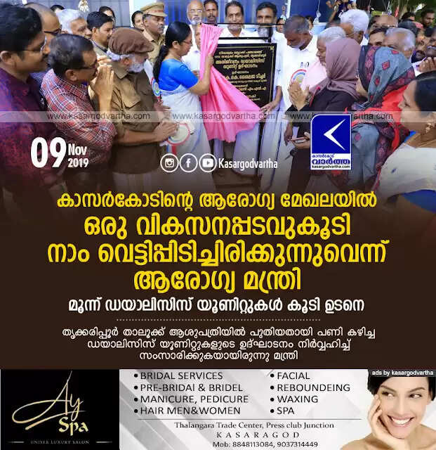 കാസര്‍കോടിന്റെ ആരോഗ്യ മേഖലയില്‍ ഒരു വികസനപ്പടവുകൂടി നാം വെട്ടിപ്പിടിച്ചിരിക്കുന്നുവെന്ന് ആരോഗ്യ മന്ത്രി; മൂന്ന് ഡയാലിസിസ് യൂണിറ്റുകള്‍ കൂടി ഉടനെ