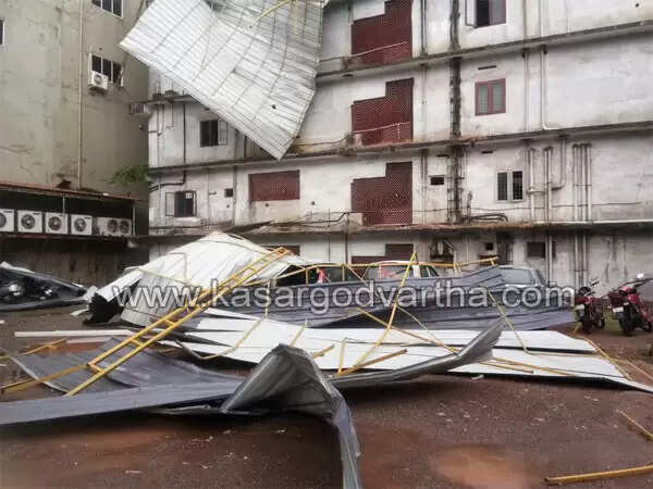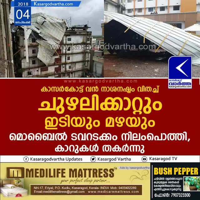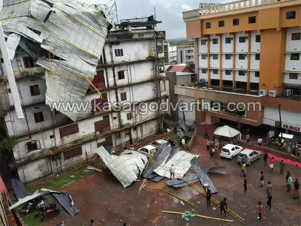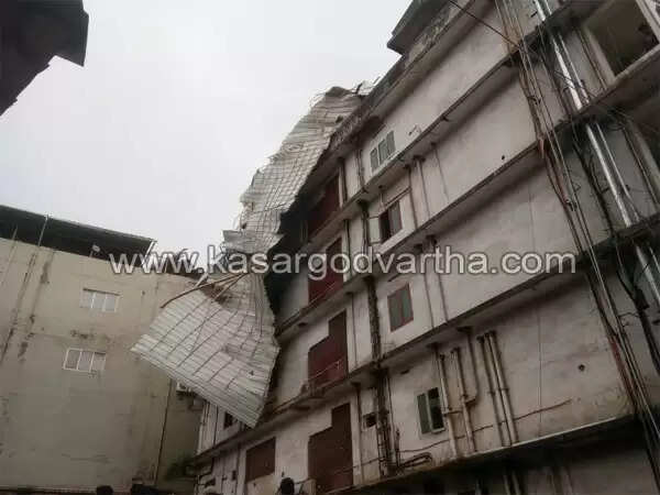 കാസര്കോട് പുതിയ ബസ് സ്റ്റാന്ഡ് മുന്വശത്തെ വന്കിട വ്യാപാര സ്ഥാപനത്തിന്റെ മേല്ക്കൂര പറന്നു പോയി തൊട്ടടുത്ത കെട്ടിടത്തിലും പതിച്ചു. കെട്ടിടത്തിന്റെ മുകളില് സ്ഥാപിച്ച മൊബൈല് ടവറും പൂര്ണമായും തകര്ന്നു. തൊട്ടടുത്ത് പ്രവര്ത്തിക്കുന്ന ഐവ സില്ക്സിന്റെ കെട്ടിടത്തിനും കമ്പി വന്ന് വീണ് കേടുപാട് സംഭവിച്ചു. ഐവയുടെ പാര്ക്കിംഗ് സ്ഥലത്ത് നിര്ത്തിയിട്ടിരുന്ന മൂന്നോളം കാറുകള്ക്ക് ഭാഗികമായി കേടുപാട് സംഭവിച്ചു.
