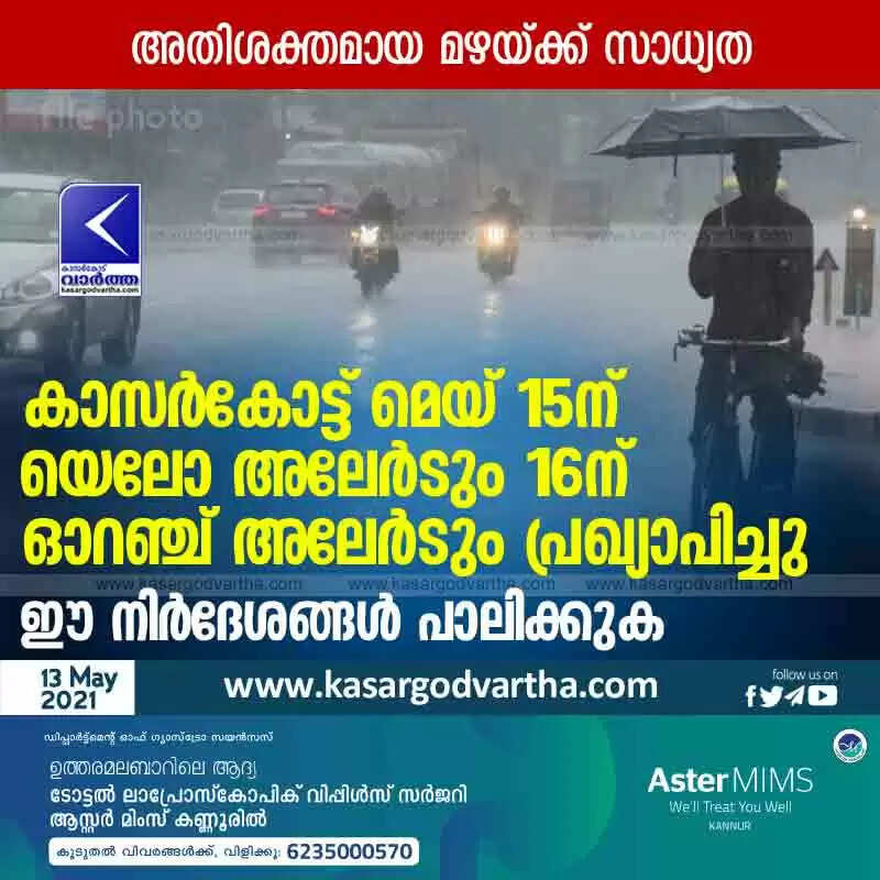 കാസർകോട്ട് മെയ് 15ന് യെലോ അലേർടും 16ന് ഓറഞ്ച് അലേർടും പ്രഖ്യാപിച്ചു; ഈ നിർദേശങ്ങൾ പാലിക്കുക