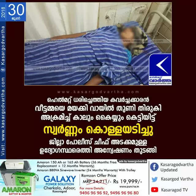 കാസര്‍കോട്:  (www.kasargodvartha.com 30.06.2018) ഹെല്‍മറ്റ് ധരിച്ചെത്തിയ കവര്‍ച്ചക്കാരന്‍ വീട്ടമ്മയെ മയക്കി വായില്‍ തുണി തിരുകി കാലും കൈയ്യും കെട്ടിയിട്ട് സ്വര്‍ണ്ണം കൊള്ളയടിച്ചു. വിദ്യാനഗര്‍ പോലീസ് സ്റ്റേഷന്‍ പരിധിയില്‍പ്പെട്ട ചെര്‍ക്കള എതിര്‍ത്തോട് കുണ്ടോളം മൂല ബദര്‍നഗറിലെ മുഹമ്മദ് കുഞ്ഞിയുടെ ഭാര്യ സുഹറ (40) ആണ് കൊള്ളയ്ക്കിരയായത്. ശനിയാഴ്ച സന്ധ്യയോടെയാണ് നാടിനെ നടുക്കിയ സംഭവം അരങ്ങേറിയത്.