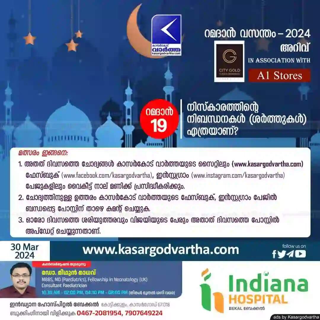 (KasargodVartha) അറിവ് 19 (30.03.2024): നിസ്കാരത്തിന്റെ നിബന്ധനകള് (ശർത്തുകൾ) എത്രയാണ്?