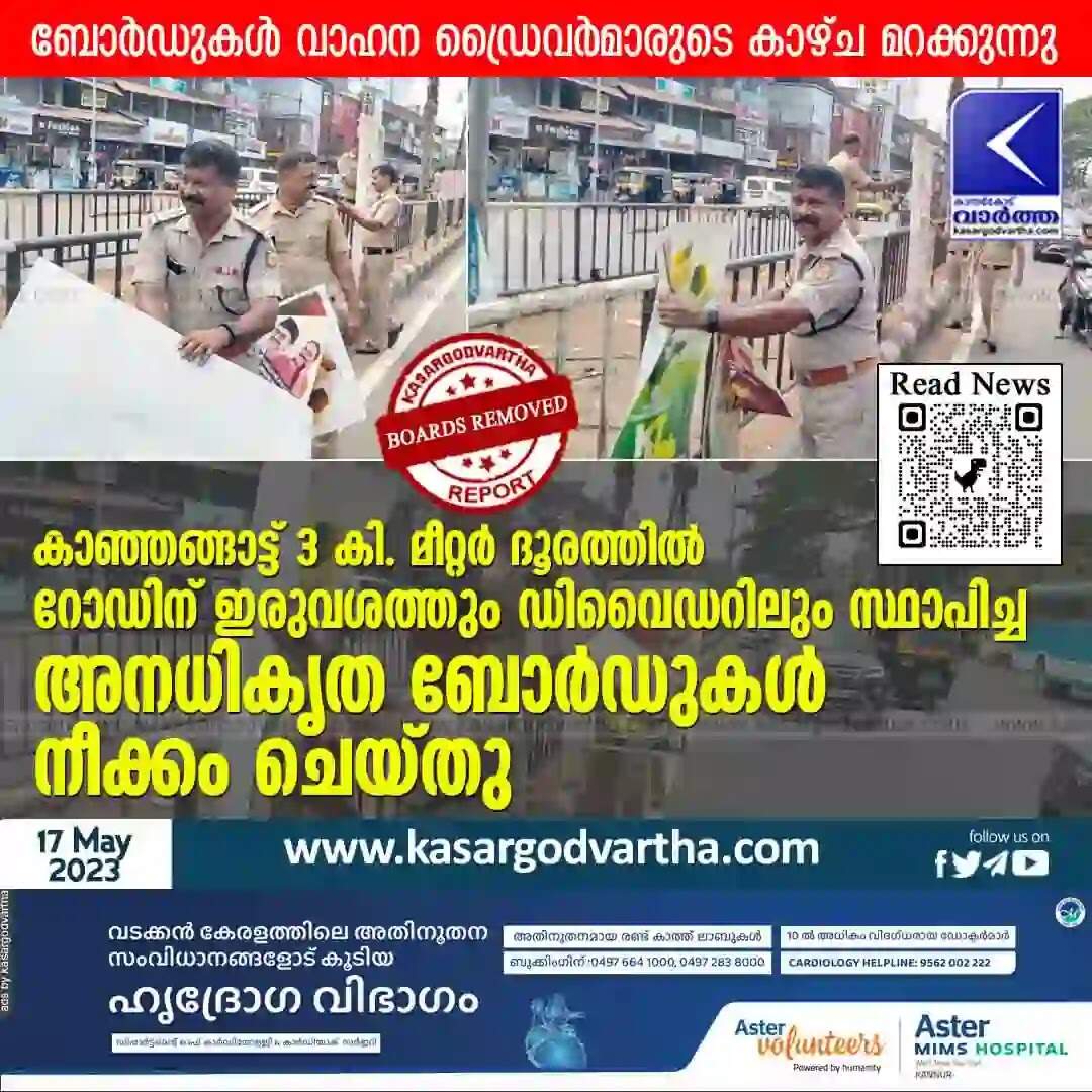 Boards Removed | കാഞ്ഞങ്ങാട്ട് 3 കി. മീറ്റർ ദൂരത്തിൽ റോഡിന് ഇരുവശത്തും ഡിവൈഡറിലും സ്ഥാപിച്ച അനധികൃത ബോർഡുകൾ നീക്കം ചെയ്തു