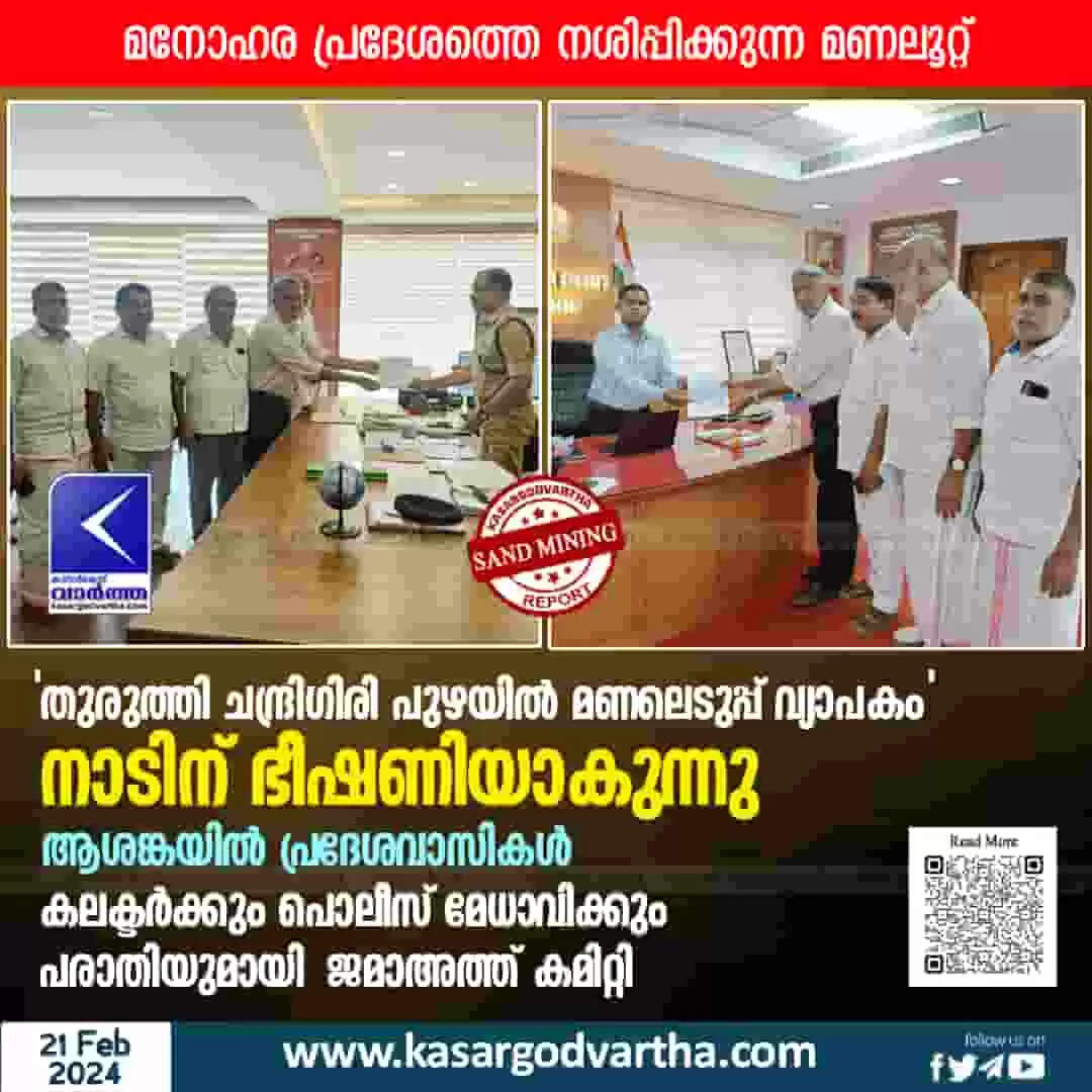 അതിനിടെ ചന്ദ്രിഗിരി പുഴയിലെ മണൽ കടത്തിനെതിരെ അടിയന്തരമായി നടപടി ആവശ്യപ്പെട്ട് തുരുത്തി മുഹ്യുദ്ദീൻ ജമാഅത് കമിറ്റിയുടെ നേതൃത്വത്തിൽ ജില്ലാ കലക്ടർക്കും ജില്ലാ പൊലീസ് മേധാവിക്കും പരാതി നൽകി. ജമാഅത് കമിറ്റി പ്രസിഡണ്ട് ടി എ ശാഫി, ജെനറൽ സെക്രടറി ടി എ അബ്ദുർ റഹ്മാൻ ഹാജി, ട്രഷറർ ടി എ അബ്ദുല്ല കുഞ്ഞി ഹാജി, വൈസ് പ്രസിഡണ്ടുമാരായ ടി എ മുഹമ്മദ് കുഞ്ഞി, ബി എസ് ശംസുദ്ദീൻ, പ്രവർത്തക സമിതി അംഗം ശരീഫ് എം എസ് തുടങ്ങിയവരാണ് ഉന്നത ഉദ്യോഗസ്ഥരെ കണ്ടത്.