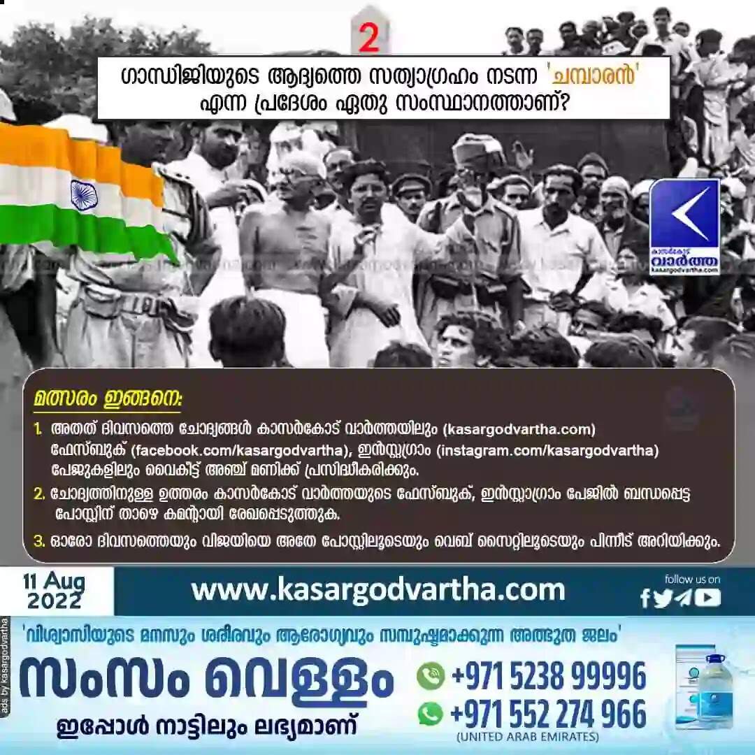 Keywords: Independence Day, Quiz, Competition, Malayalam Quiz, Independence Day Quiz, In which state Champaran is located?.