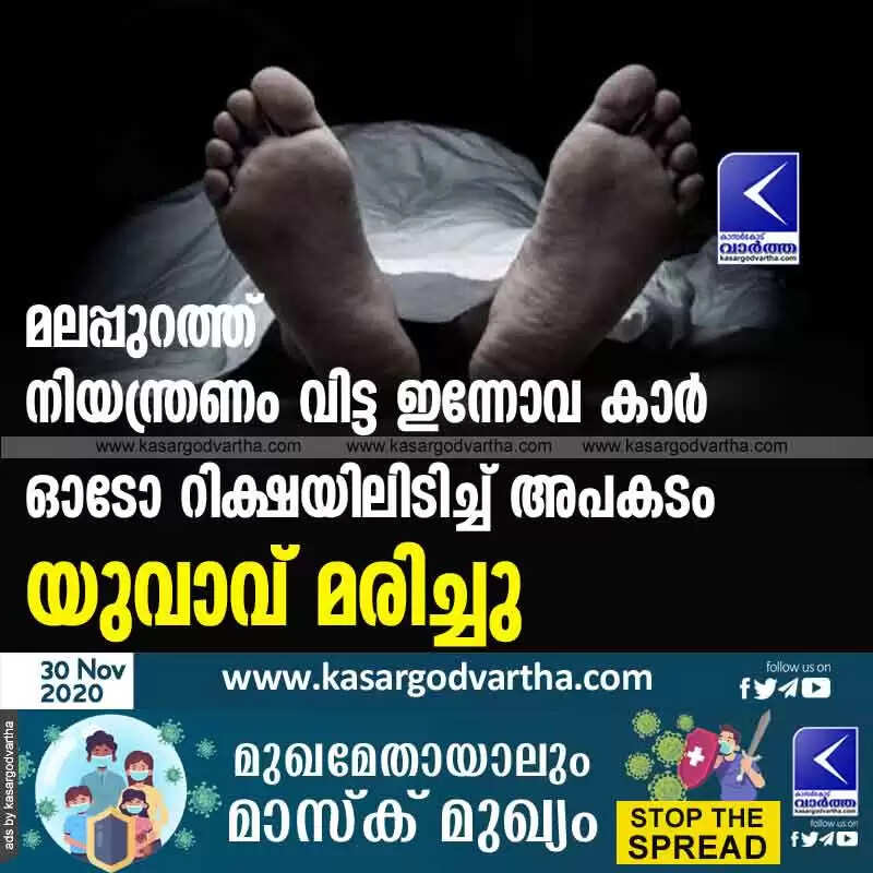 മലപ്പുറത്ത് നിയന്ത്രണം വിട്ട ഇന്നോവ കാര് ഓടോ റിക്ഷയിലിടിച്ച് അപകടം; യുവാവ് മരിച്ചു