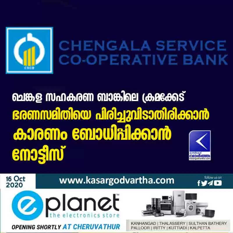ചെങ്കള സഹകരണ ബാങ്കിൽ നടന്ന ക്രമക്കേട്: ഭരണസമിതിയെ പിരിച്ചുവിടാതിരിക്കാൻ കാരണം ബോധിപ്പിക്കാൻ നോട്ടീസ്