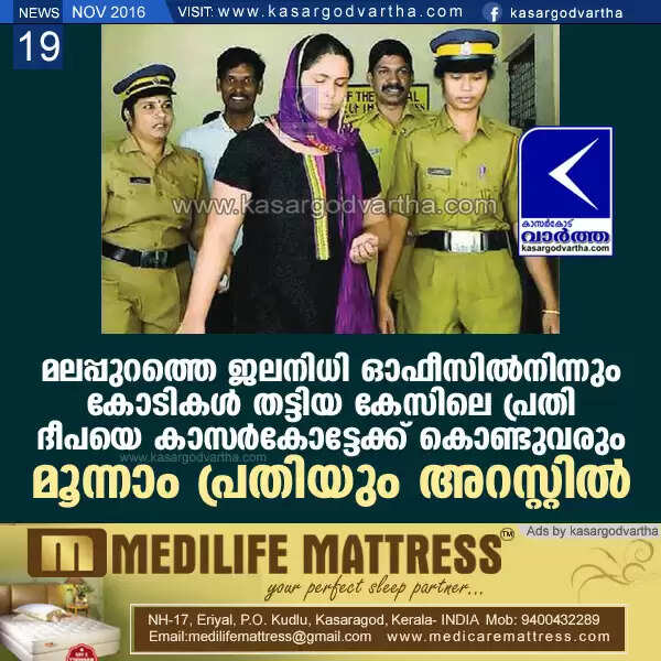 മലപ്പുറത്തെ ജലനിധി ഓഫീസില്‍നിന്നും കോടികള്‍ തട്ടിയ കേസിലെ പ്രതി ദീപയെ കാസര്‍കോട്ടേക്ക് കൊണ്ടുവരും; മൂന്നാം പ്രതിയും അറസ്റ്റില്‍