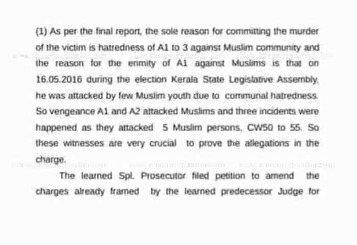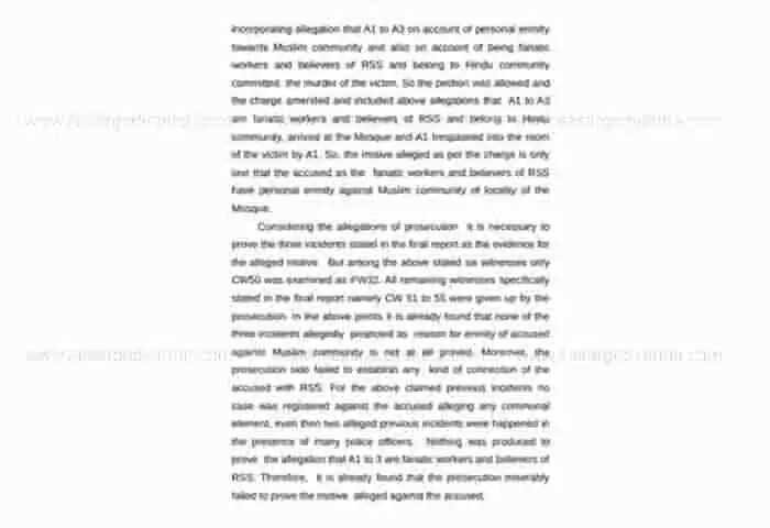 പ്രതികൾക്ക് ആർഎസ്എസുമായി ബന്ധമുണ്ട് എന്നതിന് തെളിവുകൾ ഹാജരാക്കാൻ പ്രോസിക്യൂഷന് സാധിച്ചിട്ടില്ലെന്നും വിധിന്യായത്തിലുണ്ട്. പ്രതികൾക്ക് മുസ്ലിം സമുദായത്തോടുള്ള വെറുപ്പാണ് കൊലപാതകത്തിലേക്ക് നയിച്ചതെന്ന പ്രോസിക്യൂഷന്റെ വാദവും കോടതി തള്ളി. ഇത് തെളിയിക്കുന്നതിൽ പ്രോസിക്യൂഷൻ പൂർണമായും പരാജയപ്പെട്ടുവെന്നും മുസ്ലിം സമുദായത്തോടുള്ള പ്രതികളുടെ ശത്രുതയ്ക്ക് കാരണമായി ആരോപിക്കപ്പെടുന്ന മൂന്ന് സംഭവങ്ങളിൽ ഒന്നുപോലും തെളിയിക്കാനായില്ലെന്നും വിധിയിൽ പറയുന്നു. ഹാജരാക്കിയ ഫോൺ കോൾ വിവരങ്ങൾ മസ്ജിദിലെ പ്രതിയുടെ സാന്നിധ്യത്തിനുള്ള തെളിവായി കണക്കാക്കാനാവില്ലെന്നും കോടതി വ്യക്തമാക്കി.