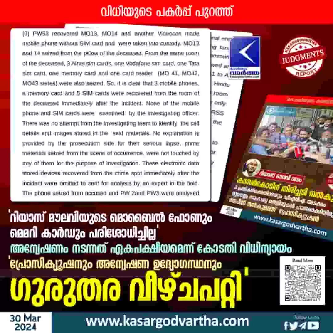 Judgment | 'റിയാസ് മൗലവിയുടെ മൊബൈൽ ഫോണും മെമറി കാർഡും പരിശോധിച്ചില്ല'; അന്വേഷണം നടന്നത് ഏകപക്ഷീയമെന്ന് കോടതി വിധിന്യായം; 'പ്രോസിക്യൂഷനും അന്വേഷണ ഉദ്യോഗസ്ഥനും ഗുരുതര വീഴ്ചപറ്റി'