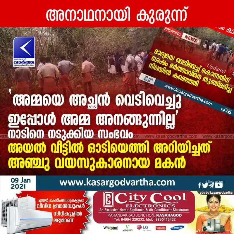Keywords: Kerala, News, Kasaragod, Adhur, Murder, Husband, Wife, Death, Son, Top-Headlines, Police, Case, Kanathur Murder: The incident was reported by the five year old son who ran to the neighbouring house.