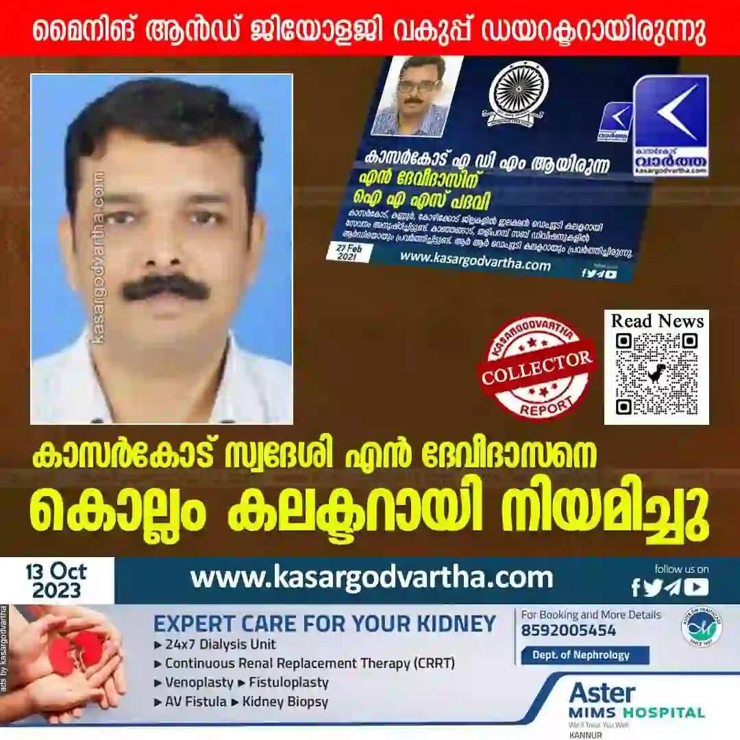 Keywords: News, Kerala, Kasaragod, Collector, Nileswaram, ADM, Kasaragod native N Devidasan appointed as Kollam Collector. < !- START disable copy paste -->
