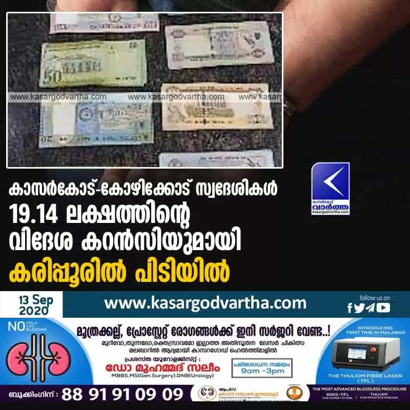കാസർകോട്-കോഴിക്കോട് സ്വദേശികൾ 19.14 ലക്ഷത്തിന്റെ വിദേശ കറന്സിയുമായി കരിപ്പൂരില് പിടിയില്