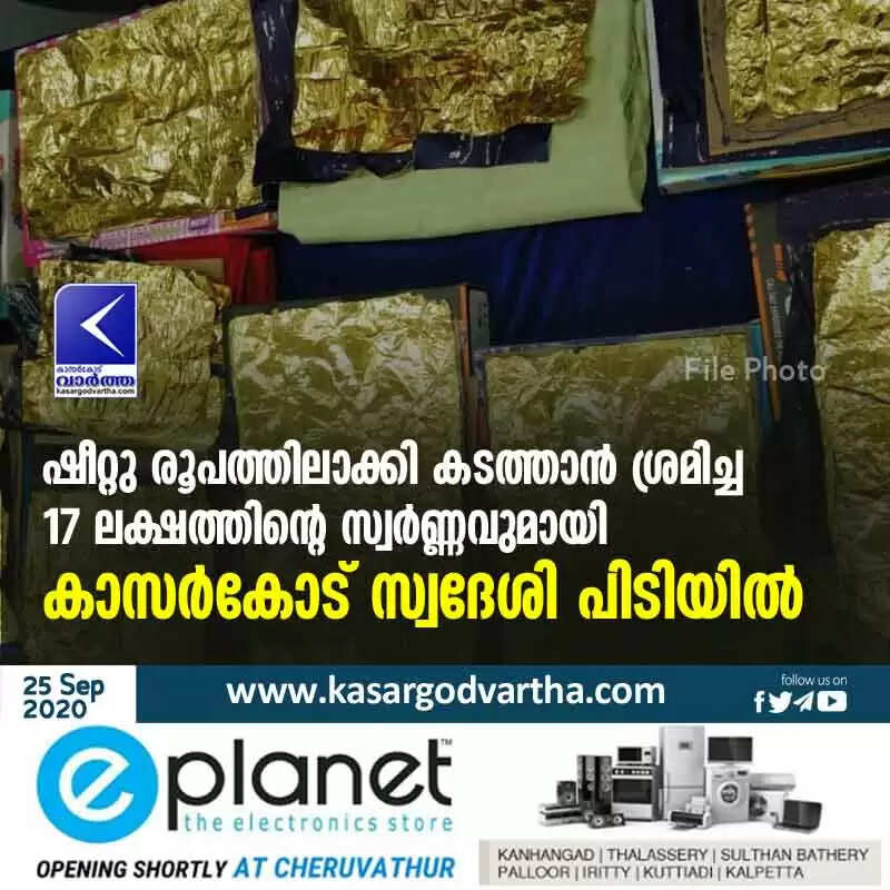 Keywords: Kerala, News, Kasaragod, Gold, Airport, Top-Headlines, Arrest, Natives, Kasargod resident arrested for trying to smuggle gold worth Rs 17 lakh in sheet form.