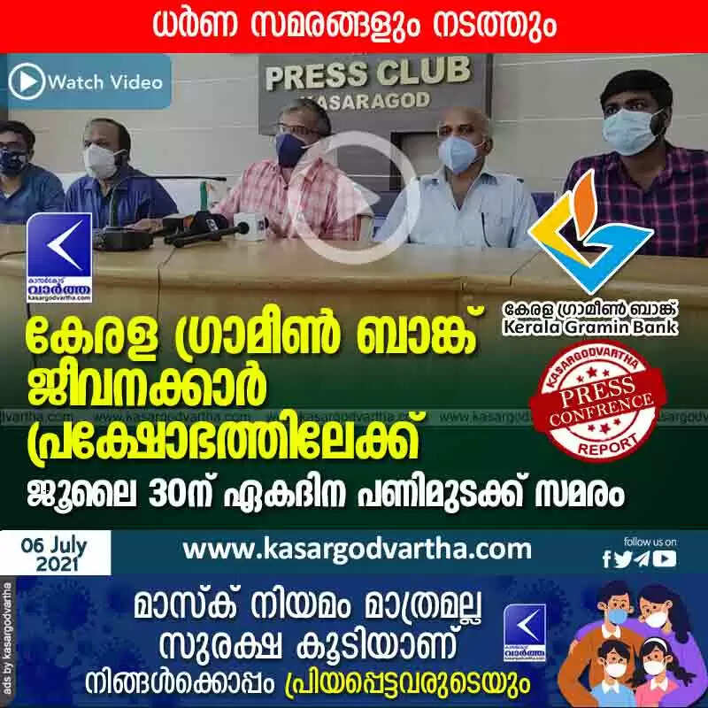 Keywords:  Kerala, News, Kasaragod, Top-Headlines, Bank, Employees, Protest, Press meet, Press Club, Kerala Gramina Bank employees go on strike; One day strike on July 30. < !- START disable copy paste -->