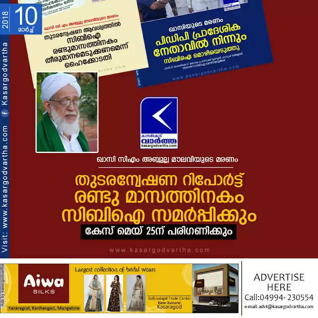 Keywords: Kasaragod, Kerala, news, Death, Top-Headlines, C.M Abdulla Maulavi, CBI, Investigation, Khazi C.M Abdulla Moulavi's death; CBI will submit Investigation report within 2 months.