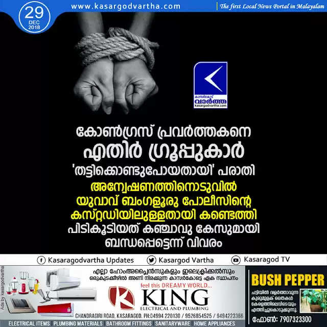 കുമ്പള: (www.kasargodvartha.com 29.12.2018) കോണ്‍ഗ്രസ് പ്രവര്‍ത്തകനെ എതിര്‍ ഗ്രൂപ്പുകാര്‍ 'തട്ടിക്കൊണ്ടുപോയതായി' പോലീസില്‍ പരാതി എത്തി. അന്വേഷണത്തിനൊടുവില്‍ യുവാവ് ബംഗളൂരു പോലീസിന്റെ കസ്റ്റഡിയിലുള്ളതായി കുമ്പള പോലീസ് കണ്ടെത്തി. ബംഗളൂരുവില്‍ ഒരു കിലോ കഞ്ചാവുമായി പെര്‍ള സ്വദേശിയെ പോലീസ് പിടികൂടിയിരുന്നു. ഈ കേസുമായി ബന്ധപ്പെട്ട് പിടിയിലായയാള്‍ സഹകരണ ബാങ്ക് ജീവനക്കാരന്റെ പേര് പറഞ്ഞിട്ടുണ്ടെന്ന് വ്യക്തമാക്കിയതോടെ പോലീസ് ഇയാളെ കസ്റ്റഡിയിലെടുത്തത്.