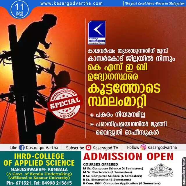 കാലവര്‍ഷം തുടങ്ങുന്നതിന് മുമ്പ് കാസര്‍കോട് ജില്ലയില്‍ നിന്നും കെ എസ് ഇ ബി ഉദ്യോഗസ്ഥരെ കൂട്ടത്തോടെ സ്ഥലംമാറ്റി; പകരം നിയമനമില്ല, പരാതിപ്രളയത്തില്‍ മുങ്ങി വൈദ്യുതി ഓഫീസുകള്‍