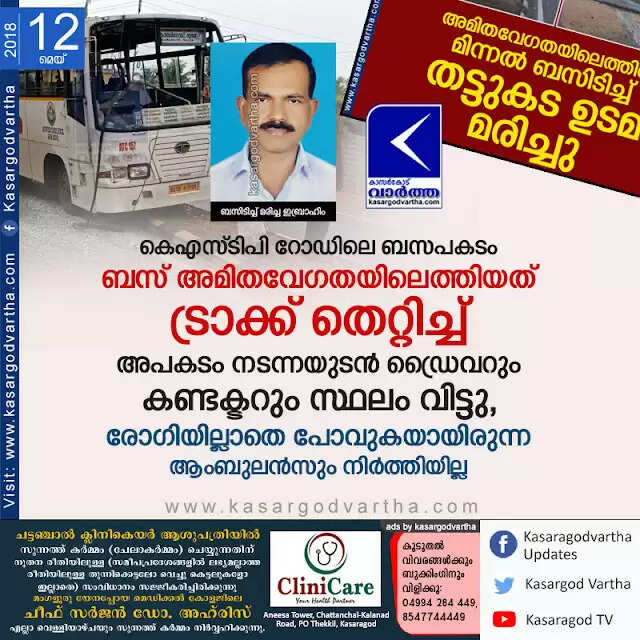 Keywords: Kasaragod, Kerala, News, Road, Bus-accident, Chemnad, Ambulance, KSTP Road Accident; Bus's over speed kills a man.
