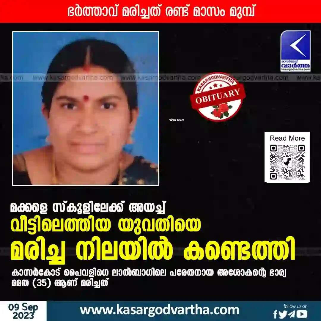 കുമ്പള: (www.kasargodvartha.com) മക്കളെ സ്‌കൂളിലേയ്ക്ക് അയച്ച് വീട്ടിലെത്തിയതിന് പിന്നാലെ യുവതിയെ മരിച്ച നിലയില്‍ കണ്ടെത്തി. പൈവളിഗെ ലാല്‍ബാഗിലെ പരേതനായ അശോകന്റെ ഭാര്യ മമത (35) ആണ് മരിച്ചത്.