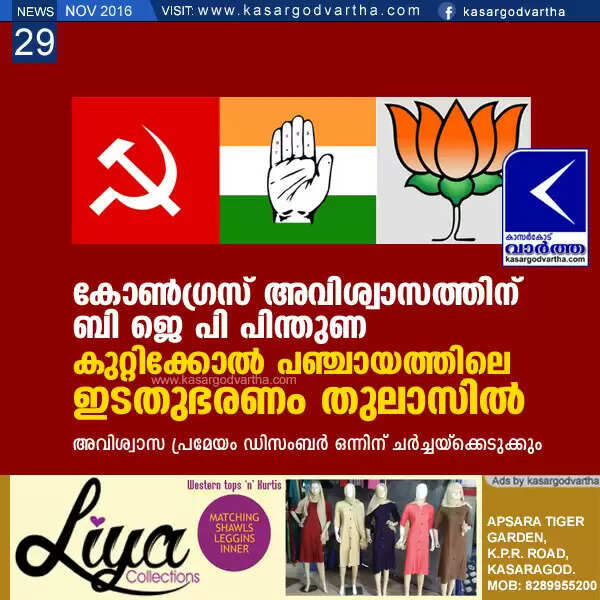 കോണ്ഗ്രസ് അവിശ്വാസത്തിന് ബി ജെ പി പിന്തുണ; കുറ്റിക്കോല് പഞ്ചായത്തിലെ ഇടതുഭരണം തുലാസില്