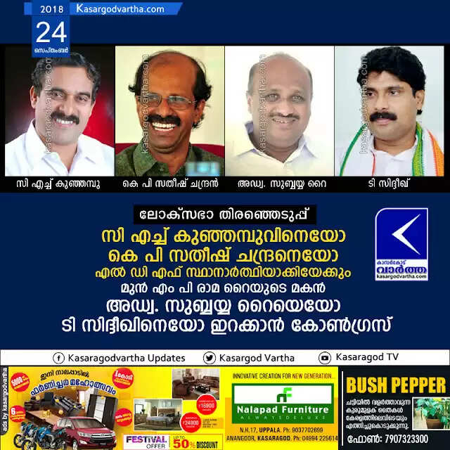 ലോക്‌സഭാ തിരഞ്ഞെടുപ്പ്: സി എച്ച് കുഞ്ഞമ്പുവിനെയോ കെ പി സതീഷ് ചന്ദ്രനെയോ എല്‍ ഡി എഫ് സ്ഥാനാര്‍ത്ഥിയാക്കിയേക്കും, മുന്‍ എം പി രാമ റൈയുടെ മകന്‍ അഡ്വ. സുബ്ബയ്യ റൈയെയോ ടി സിദ്ദീഖിനെയോ ഇറക്കാന്‍ കോണ്‍ഗ്രസ്