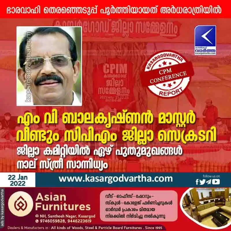 എം വി ബാലകൃഷ്ണന് മാസ്റ്റർ വീണ്ടും സിപിഎം ജില്ലാ സെക്രടറി; ജില്ലാ കമിറ്റിയിൽ ഏഴ് പുതുമുഖങ്ങൾ; നാല് സ്ത്രീ സാന്നിധ്യം; ഭാരവാഹി തെരഞ്ഞെടുപ്പ് പൂർത്തിയായത് അർധരാത്രിയിൽ