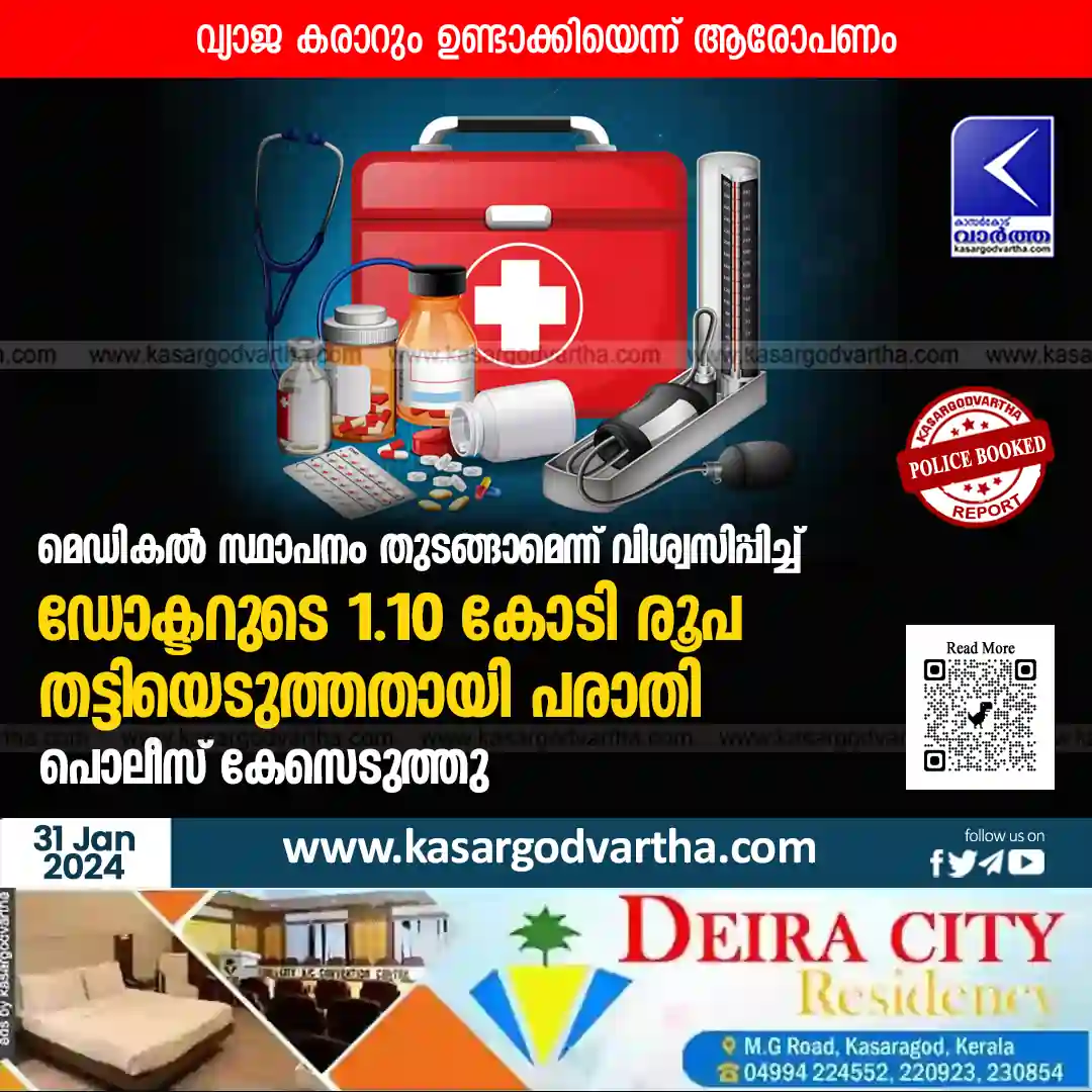 Police Booked | മെഡികൽ സ്ഥാപനം തുടങ്ങാമെന്ന് വിശ്വസിപ്പിച്ച് കാസർകോട്ടെ ഡോക്ടറുടെ 1.10 കോടി രൂപ തട്ടിയെടുത്തതായി പരാതി; പൊലീസ് കേസെടുത്തു