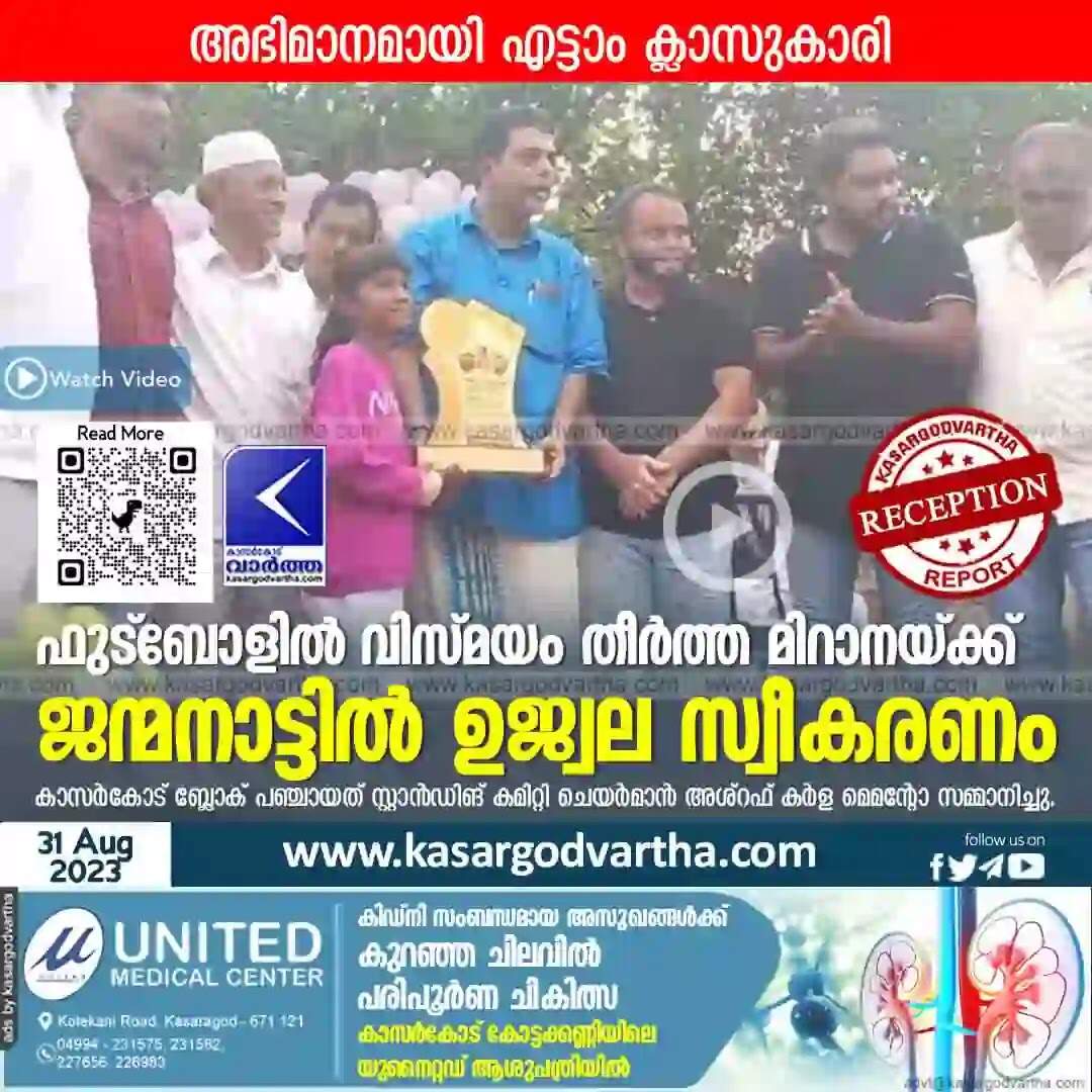 മൊഗ്രാല്‍ പുത്തൂര്‍: (www.kasargodvartha.com) പെണ്‍കുട്ടികളുടെ സംസ്ഥാന സബ് ജൂനിയര്‍ ഫുട്‌ബോള്‍ ചാംപ്യന്‍ഷിപില്‍ വിസ്മയം തീര്‍ത്ത കാസര്‍കോട് ജില്ലാ ടീം ക്യാപ്റ്റന്‍ മിറാനയ്ക്ക് ജന്മനാട്ടില്‍ ഉജ്വല സ്വീകരണം. വോയ്സ് ഓഫ് ആസാദിന്റെ ആഭിമുഖ്യത്തില്‍ മൊഗ്രാല്‍ പുത്തൂരില്‍ സംഘടിപ്പിച്ച സ്വീകരണ ചടങ്ങില്‍ മിറാനയ്ക്ക് കാസര്‍കോട് ബ്ലോക് പഞ്ചായത് സ്റ്റാന്‍ഡിങ് കമിറ്റി ചെയര്‍മാന്‍ അശ്റഫ് കര്‍ള മെമന്റോ സമ്മാനിച്ചു.