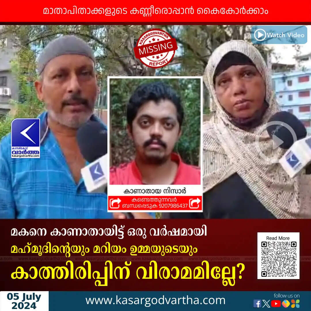 കാസർകോട്: (KasaragodVartha) മകനെ കാണാതായിട്ട് ഒരു വർഷം തികയുമ്പോഴും മഹ് മൂദിന്റെയും മറിയം ഉമ്മയുടെയും കാത്തിരിപ്പിന് വിരാമമില്ല. കുമ്പള പൊലീസ് സ്റ്റേഷൻ പരിധിയിലെ അടുക്ക കോട്ടയിലെ കാഴ്ച പരിമിതിയും കേൾവി പരിമിതിയുമുള്ള നിസാർ എന്ന 28 കാരനെയാണ് ഒരുവർഷം മുമ്പ് കാണാതായത്. പൊലീസ് സ്റ്റേഷനിലും കലക്ടർക്കും ജില്ലാ പൊലീസ് മേധാവിക്കും മുഖ്യമന്ത്രിക്കും പരാതി നൽകിയിട്ടുണ്ട്. തങ്ങളുടെ മകനെ കണ്ട് പിടിച്ച് തരുന്നതിന് പൊലീസ് ഒന്നും ചെയ്യുന്നില്ലെന്ന് മാതാപിതാക്കൾ പറയുന്നു.
