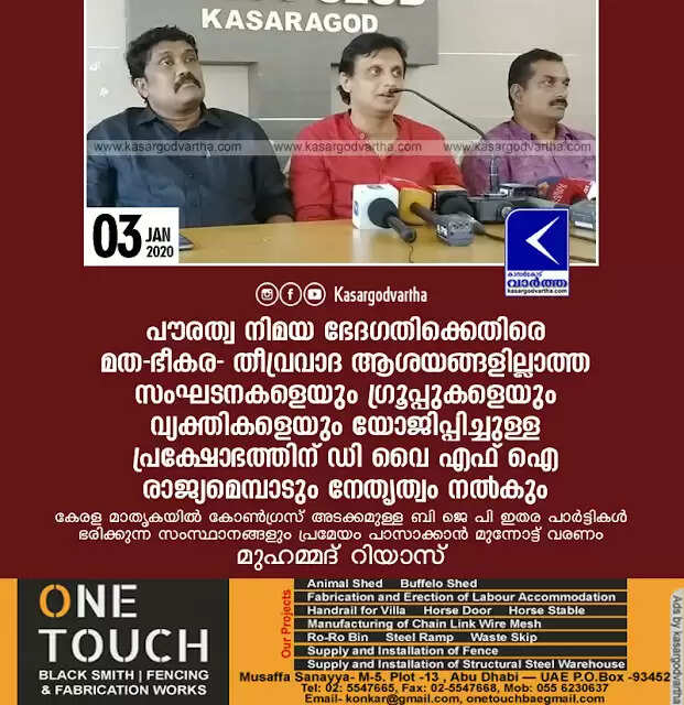 കാസര്‍കോട്: (www.kasargodvartha.com 03.01.2020) പൗരത്വ നിമയ ഭേദഗതിക്കെതിരെ മത-ഭീകര- തീവ്രവാദ ആശയങ്ങളില്ലാത്ത സംഘടനകളെയും ഗ്രൂപ്പുകളെയും വ്യക്തികളെയും യോജിപ്പിച്ചുള്ള പ്രക്ഷോഭത്തിന് ഡി വൈ എഫ് ഐ രാജ്യമെമ്പാടും നേതൃത്വം നല്‍കുമെന്നും, കേരള മാതൃകയില്‍ കോണ്‍ഗ്രസ് അടക്കമുള്ള ബി ജെ പി ഇതര പാര്‍ട്ടികള്‍ ഭരിക്കുന്ന സംസ്ഥാനങ്ങളും പൗരത്വ നിയമത്തിനെതിരെ പ്രമേയം പാസാക്കാന്‍ മുന്നോട്ട് വരണമെന്നും ഡി വൈ എഫ് ഐ അഖിലേന്ത്യാ പ്രസിഡണ്ട് മുഹമ്മദ് റിയാസ് വാര്‍ത്താ സമ്മേളനത്തില്‍ പറഞ്ഞു. രണ്ടു പേര്‍ വെടിയേറ്റു മരിച്ച മംഗളൂരുവില്‍ സന്ദര്‍ശനം നടത്തിയ ശേഷമാണ് അദ്ദേഹവും നേതാക്കളും മാധ്യമ പ്രവര്‍ത്തകരെ കണ്ടത്.