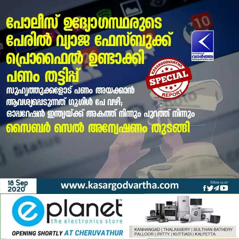 Keywords: Kerala, News, Kasaragod, Cheating, Police, Social-Media, Investigation, Top-Headlines, Money laundering by creating fake Facebook profiles in the name of police officers in the state; Cyber cell has started investigation.