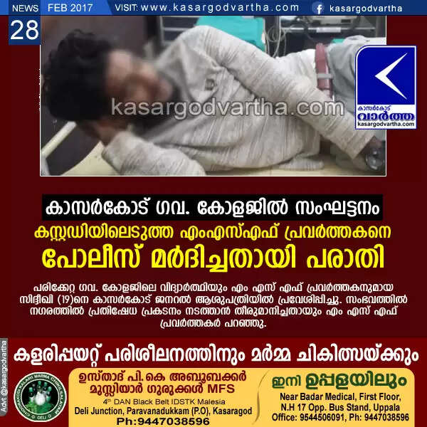 കാസര്‍കോട്: (www.kasargodvartha.com 28.02.2017) കാസര്‍കോട് ഗവ. കോളജില്‍ എസ് എഫ് ഐ - എം എസ് എഫ് പ്രവര്‍ത്തകര്‍ തമ്മിലുണ്ടായ സംഘട്ടനവുമായി ബന്ധപ്പെട്ട് കസ്റ്റഡിയിലെടുത്ത ഗവ. കോളജിലെ വിദ്യാര്‍ത്ഥിയും എം എസ് എഫ് പ്രവര്‍ത്തകനുമായ സിദ്ദീഖി (19) നെ പോലീസ് മര്‍ദിച്ചതായി പരാതി. ചൊവ്വാഴ്ച വൈകീട്ടാണ് സംഭവം.