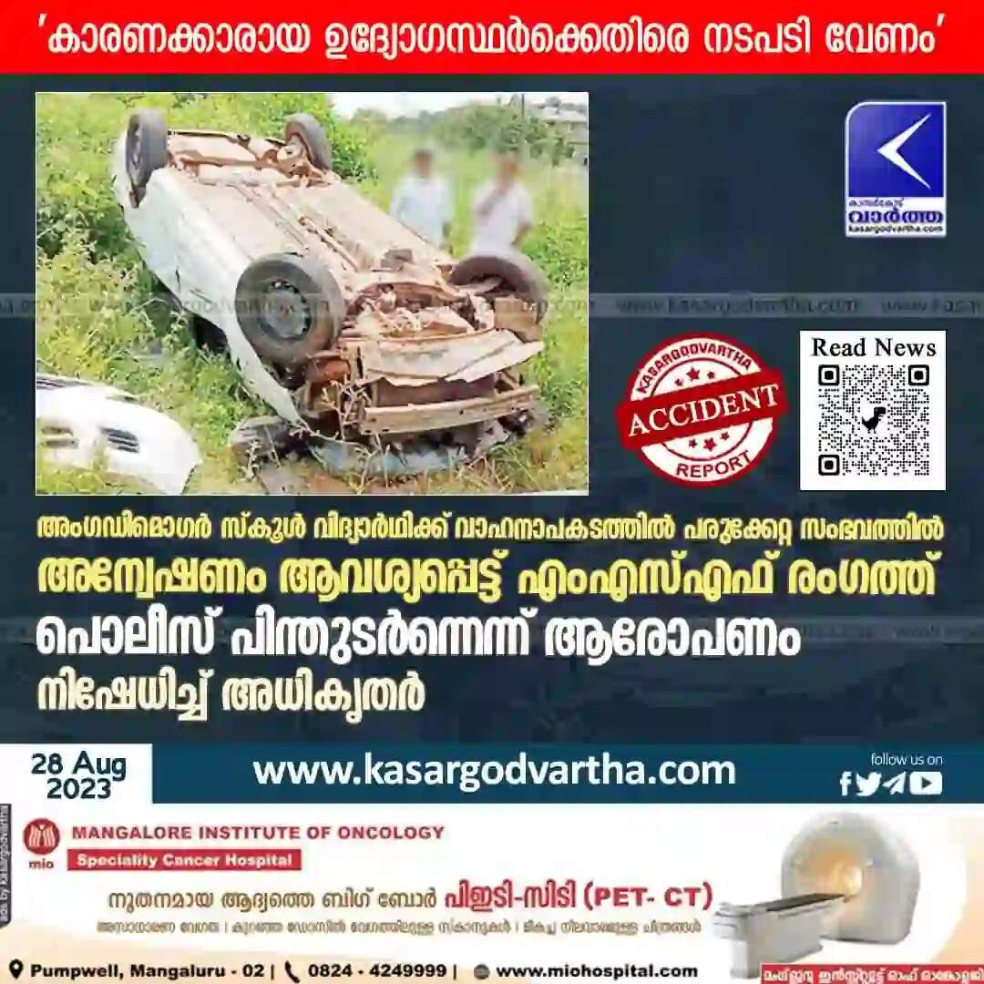 Accident | അംഗഡിമൊഗർ സ്‌കൂൾ വിദ്യാർഥിക്ക് വാഹനാപകടത്തിൽ പരുക്കേറ്റ സംഭവത്തിൽ അന്വേഷണം ആവശ്യപ്പെട്ട് എംഎസ്എഫ് രംഗത്ത്; പൊലീസ് പിന്തുടർന്നെന്ന് ആരോപണം; ഇല്ലെന്ന് പൊലീസ്