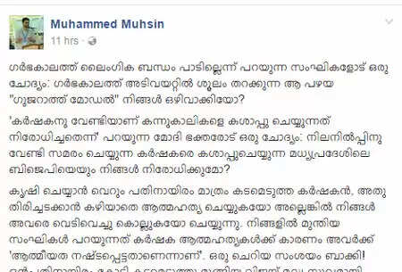 ഗര്ഭകാലത്ത് അടിവയറ്റില് ശൂലം തറക്കുന്ന ആ പഴയ 'ഗുജറാത്ത് മോഡല്' നിങ്ങള് ഒഴിവാക്കിയോ? ഗര്ഭിണികള്ക്ക് ഉപദേശം നല്കിയ ബിജെപിയോട് മുഹമ്മദ് മുഹ്സിന് എം എല് എയുടെ ചോദ്യം; ഉത്തരം പറയുന്ന സംഘ്പരിവാറുകള്ക്ക് ബീഫ് ബിരിയാണി സമ്മാനം തരാമെന്നും എം എല് എ