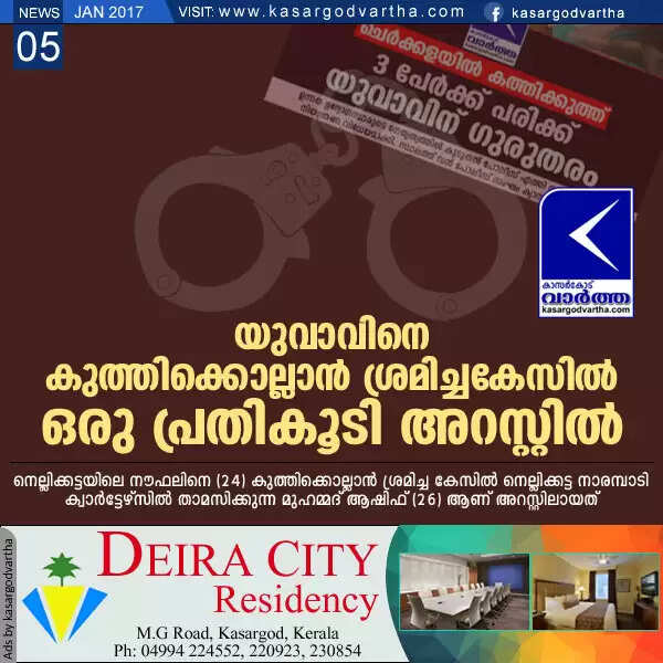 ചെര്ക്കള: (www.kasargodvartha.com 05/02/2017) ചെര്ക്കളയില് ഇരുവിഭാഗം യുവാക്കള് തമ്മിലുണ്ടായ ഏറ്റുമുട്ടലിനിടെ യുവാവിനെ കുത്തിക്കൊല്ലാന് ശ്രമിച്ചകേസില് ഒരു പ്രതികൂടി അറസ്റ്റില്. നെല്ലിക്കട്ടയിലെ നൗഫലിനെ (24) കുത്തിക്കൊല്ലാന് ശ്രമിച്ച കേസില് നെല്ലിക്കട്ട നാരമ്പാടി ക്വാര്ട്ടേഴ്സില് താമസിക്കുന്ന മുഹമ്മദ് ആഷിഫ് (26) ആണ് അറസ്റ്റിലായത്.