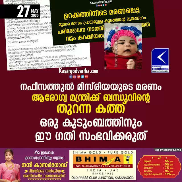 കാസര്‍കോട്: (www.kasargodvartha.com 27.05.2020) കാസര്‍കോട് ചൗക്കി പെരിയടുക്കയിലെ വാഹിദ - തൃക്കരിപ്പൂര്‍ മെട്ടമ്മല്‍ സ്വദേശി ജാഫര്‍ ബിന്‍ ഹിബത്തുല്ല ദമ്പതികളുടെ മൂന്നര മാസം പ്രായമുള്ള നഫീസത്തുല്‍ മിസ് രിയയുടെ മരണത്തെ തുടര്‍ന്നുണ്ടായ ദുരനുഭവം വിവരിച്ചു കൊണ്ട് ബന്ധു അബു സല്‍മാന്‍ ആരോഗ്യ മന്ത്രിക്ക് തുറന്ന കത്ത് അയച്ചു. ഒരു കുടുംബത്തിനും ഈ ഗതി സംഭവിക്കരുതെന്ന് വ്യക്തമാക്കിയുള്ള കത്തില്‍ കുഞ്ഞിന്റെ മരണത്തില്‍ വിറങ്ങലിച്ചു നിന്ന വീട്ടുകാര്‍ക്ക് സര്‍ക്കാര്‍ ആശുപത്രിയില്‍ നിന്നും അനുഭവിക്കേണ്ടി വന്ന വിഷമങ്ങളും യാതനകളുമാണ് വിവരിച്ചിരിക്കുന്നത്.