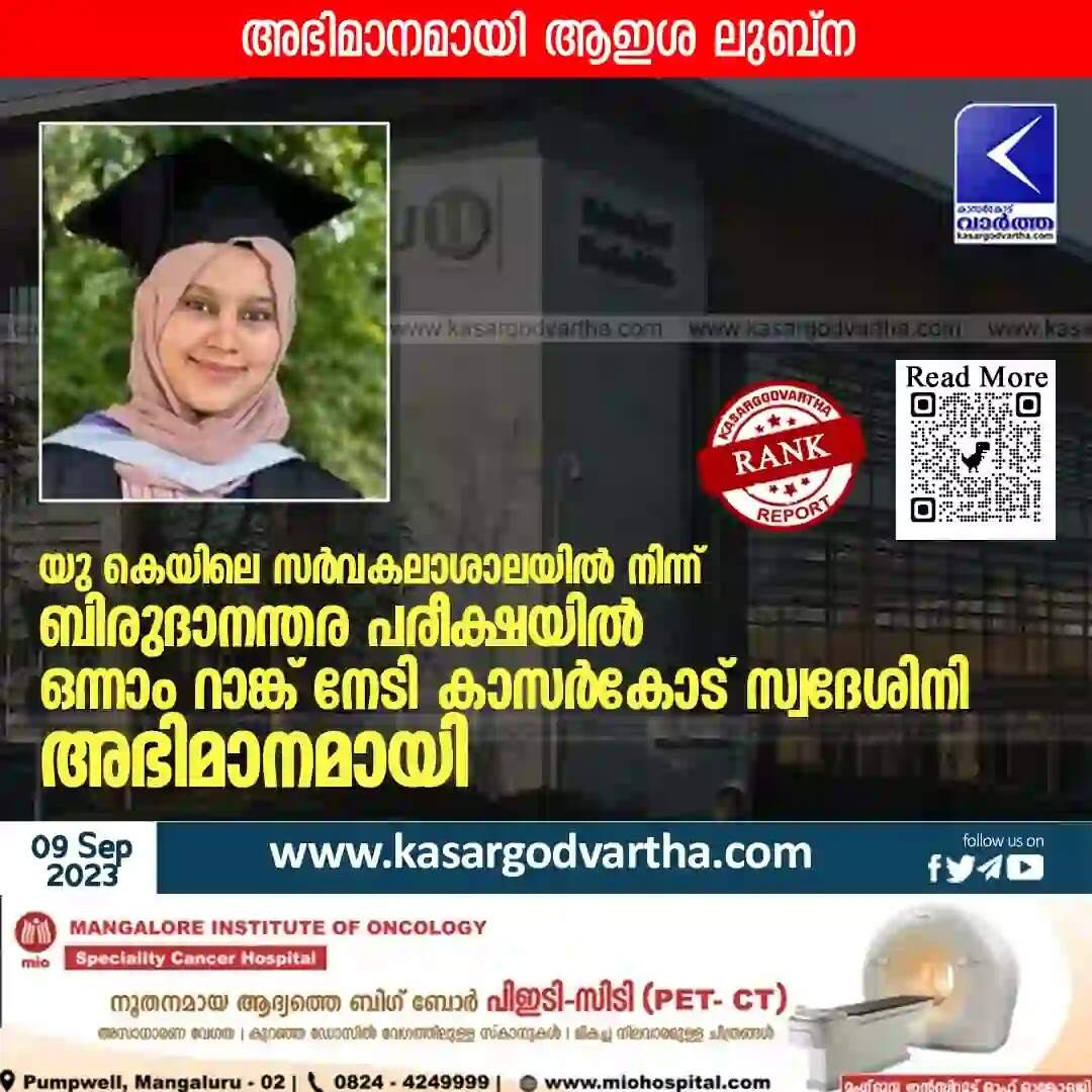 Rank | യു കെയിലെ സർവകലാശാലയിൽ നിന്ന് ബിരുദാനന്തര പരീക്ഷയിൽ ഒന്നാം റാങ്ക് നേടി കാസർകോട് സ്വദേശിനി; അഭിമാനമായി ആഇശ ലുബ്ന